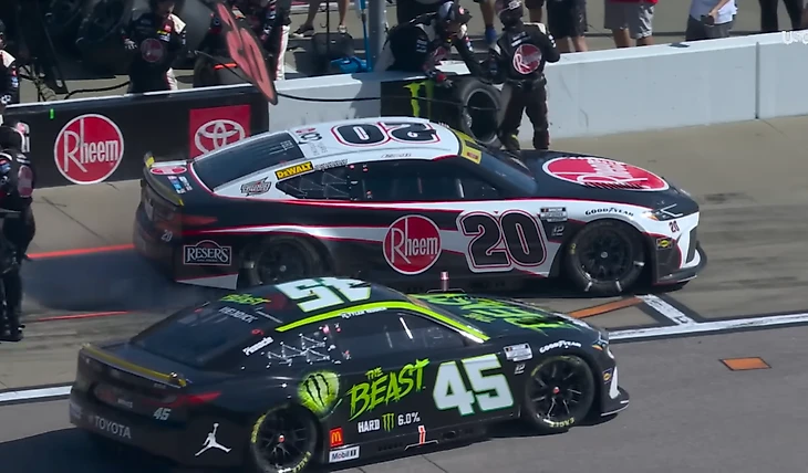 Вот мы и подошли к «основному блюду» гонки в Канзасе, но обо всем по порядку. А началось все с того, что Чейз Эллиот (№9) обгоняет Хемлина и становится новым лидером гонки, правда, ненадолго - уж больно быстры были Тойоты в тот день. Стоит запомнить этот момент.