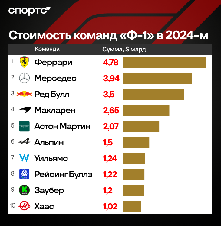 1. Бюджет за 2024-й у команды «Ф-1» – $657 млн (в 2023-м был 521 млн). В 2025-м будет не меньше. Выручка и прибыль точно больше, а траты – в зависимости от инвестиционного цикла, ведь здания и сооружения команда уже обновила. Для сравнения: «Мерседес» на пике оперировал суммой в $432 млн, а самый доминирующий сезон в истории принес «Ред Булл» оборот в $594 млн.