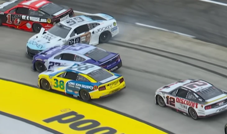 На пит-стопах под желтыми флагами происходит интересный момент – Эллиот теряет время из-за того, что механик побежал за укатившим колесом. Вспоминаем, что именно из-за этого Эллиот упал на дно в Лас-Вегасе. Хорошо, что механики предотвращают такие ситуации, но может лучше поработать над тем, чтобы колеса не укатывались?