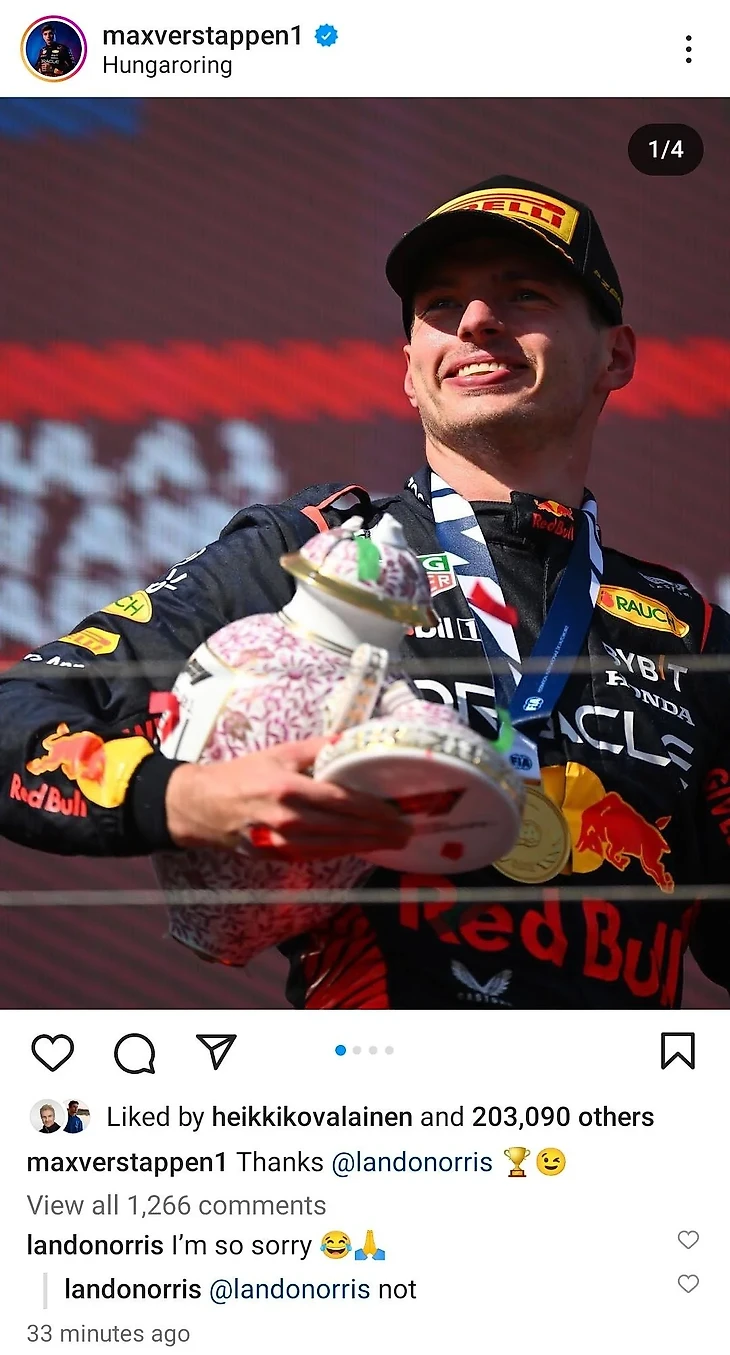 15. C 2023 года за Норрисом закрепилась репутация крушителя кубков. Серьезно пострадала награда, которую вручили Ферстаппену за победу в Венгрии.