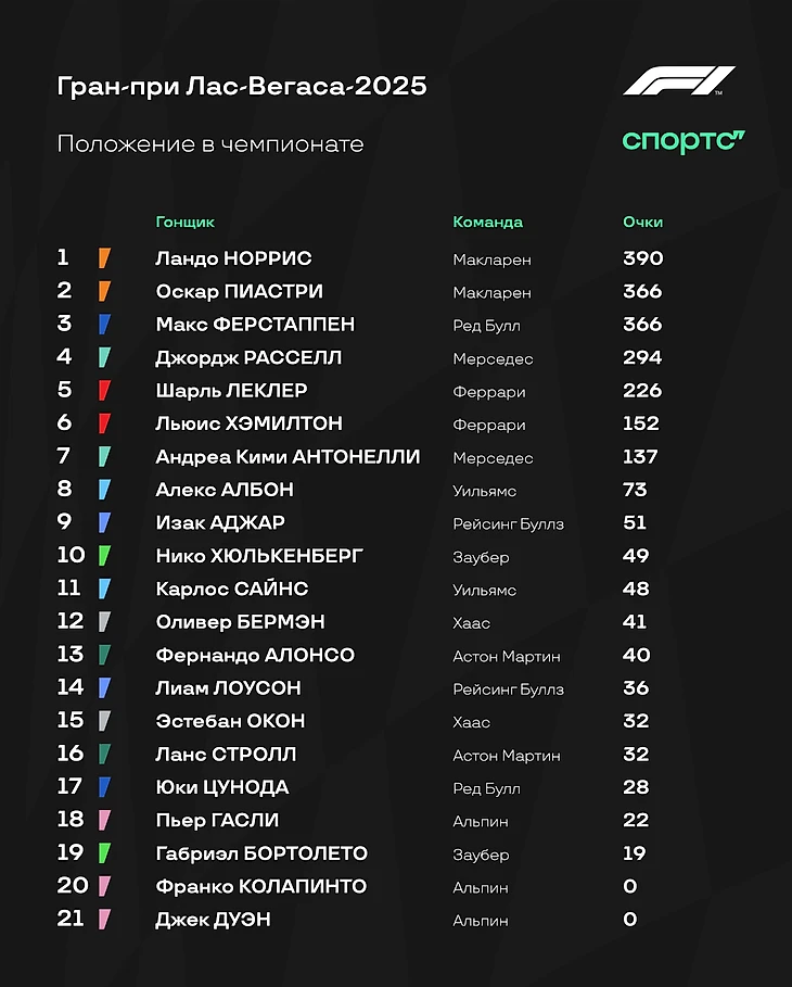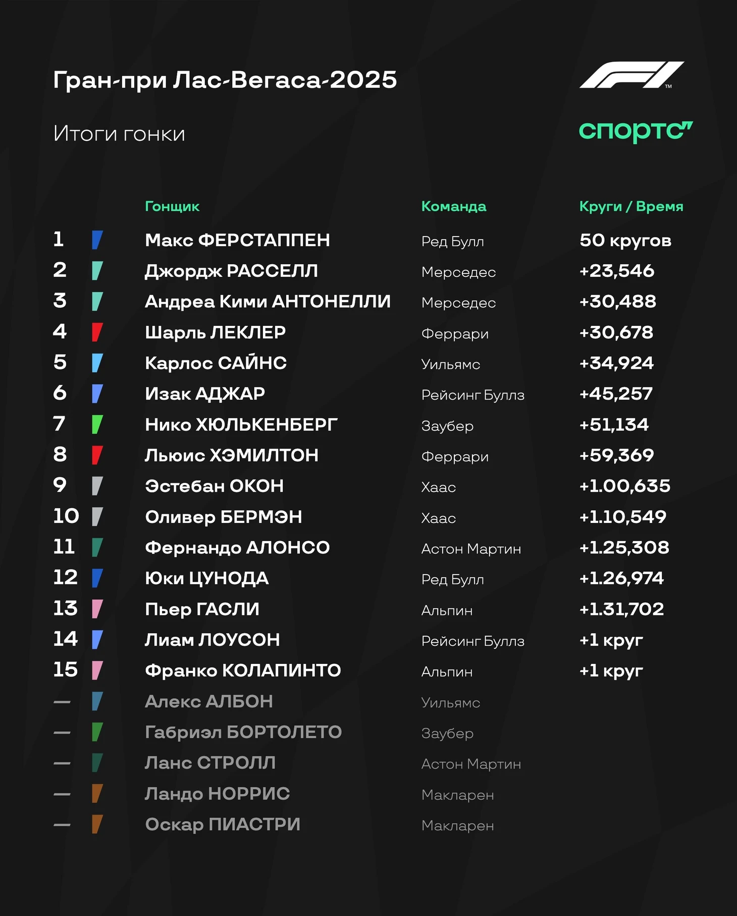 UPD: после финиша оба «Макларена» попали под угрозу дисквалификации из-за износа планки под днищем. Похоже, сбой телеметрии и электроники в третьей практике капитально разрушил Гран-при для чемпионов: оранжевые машины не проехали длинные отрезки и не смогли скалибровать настройки и референсы для точных замеров, а дождевая квалификация забрала последний шанс на отслеживание и правку проблемы. Через два часа слушаний и обсуждений Норриса и Пиастри исключили из протокола.