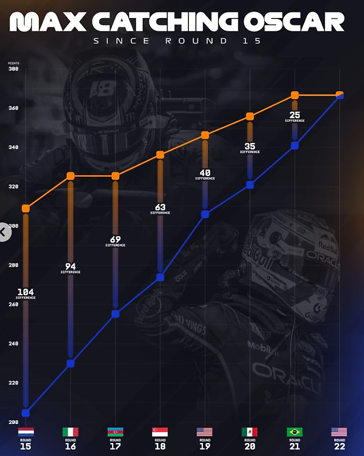 В случае равенства очков в ход пойдет подсчет первых мест (у Норриса и Пиастри их по 7, у Ферстаппена сейчас 6), а если побед тоже будет одинаковое количество, то придется считать вторые места, третьи и так далее. По вторым местам Норрис заметно опережает преследователей (9 против 4 и 5 у Оскара и Макса).