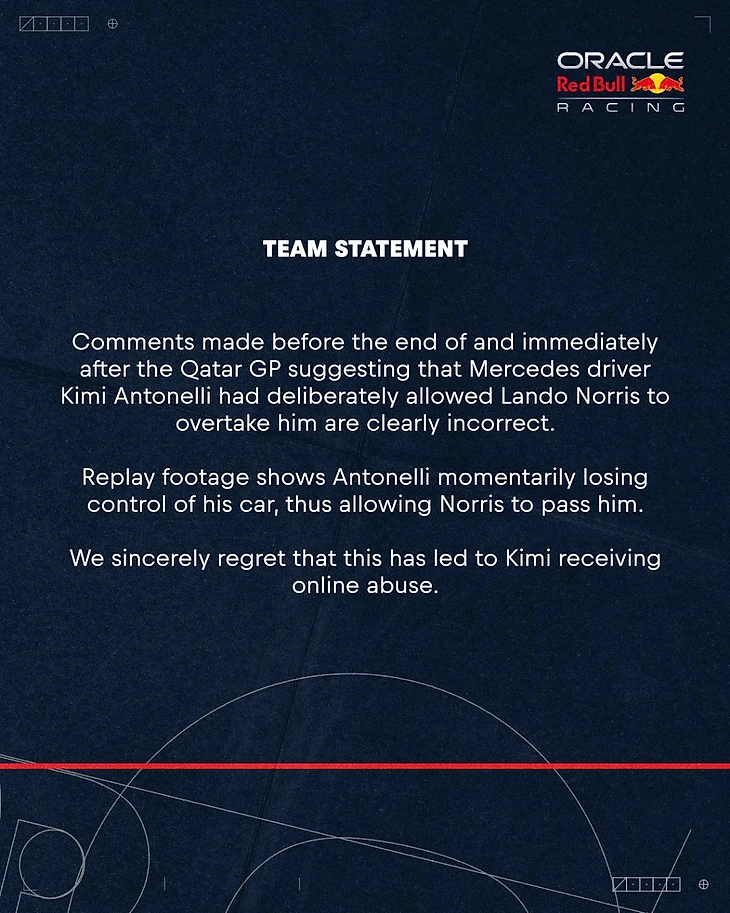 «Комментарии, сделанные в конце и сразу после Гран-при Катара и предполагавшие, что гонщик «Мерседеса» Кими Антонелли намеренно пропустил Ландо Норриса, явно не соответствуют действительности. Повторы показывают, что Антонелли на мгновение потерял контроль над болидом, и это позволило Норрису его обогнать. Нам искренне жаль, что это привело к онлайн-травле Кими».