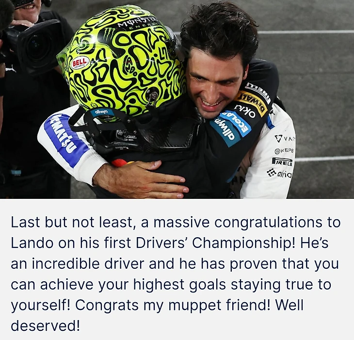 Большинство любителей Формулы-1 помнят те времена, когда Ландо Норрис и Карлос Сайнс были напарниками в «Макларене». Их дуэт фанаты называли «Карландо». Несмотря на то, что оба уже 5 лет соревнуются друг против друга, гонщики остаются хорошими друзьями и имеют большое уважение друг к другу. Испанский гонщик посвятил отдельный пост Ландо и отметил, что тот заработал заслуженное чемпионство.