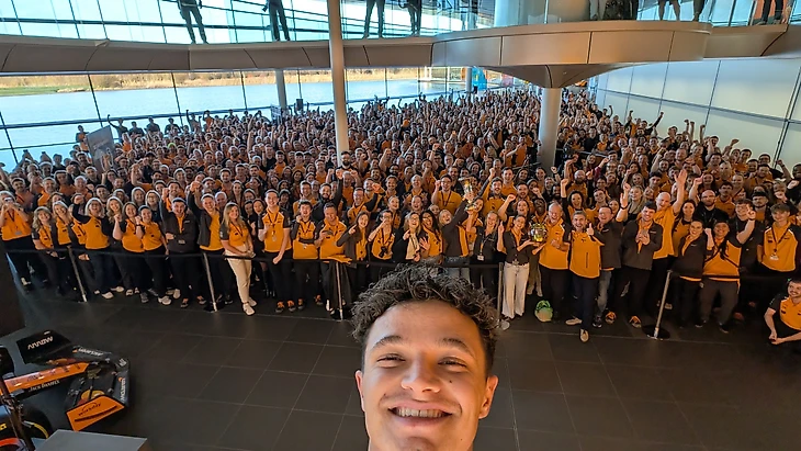 Потом Норрис решил немного пошалить, как Карлсон. Стелла спросил его о том, как он планирует делать общее фото. Ландо заявил, что полезет на тумбу, вызвав у босса реакцию в стиле «воу, воу, полегче».
