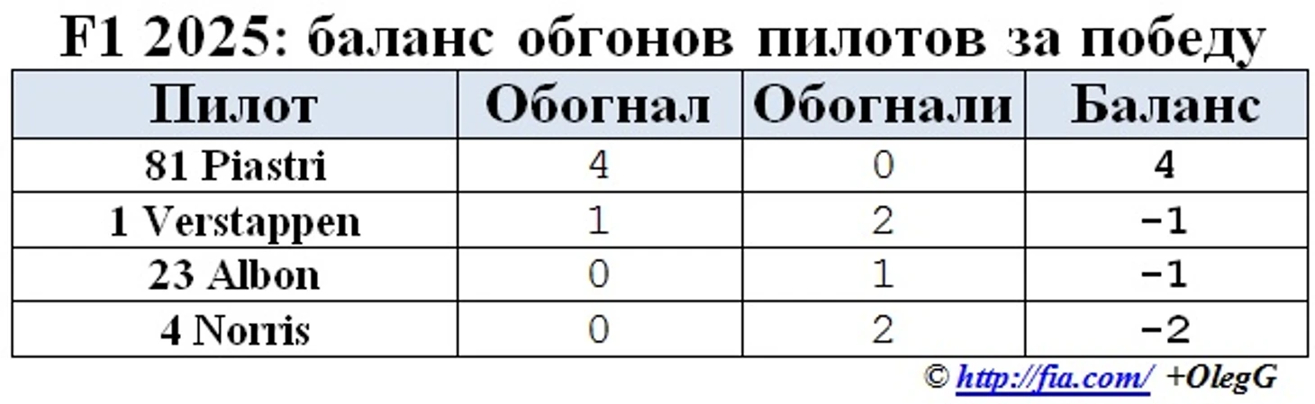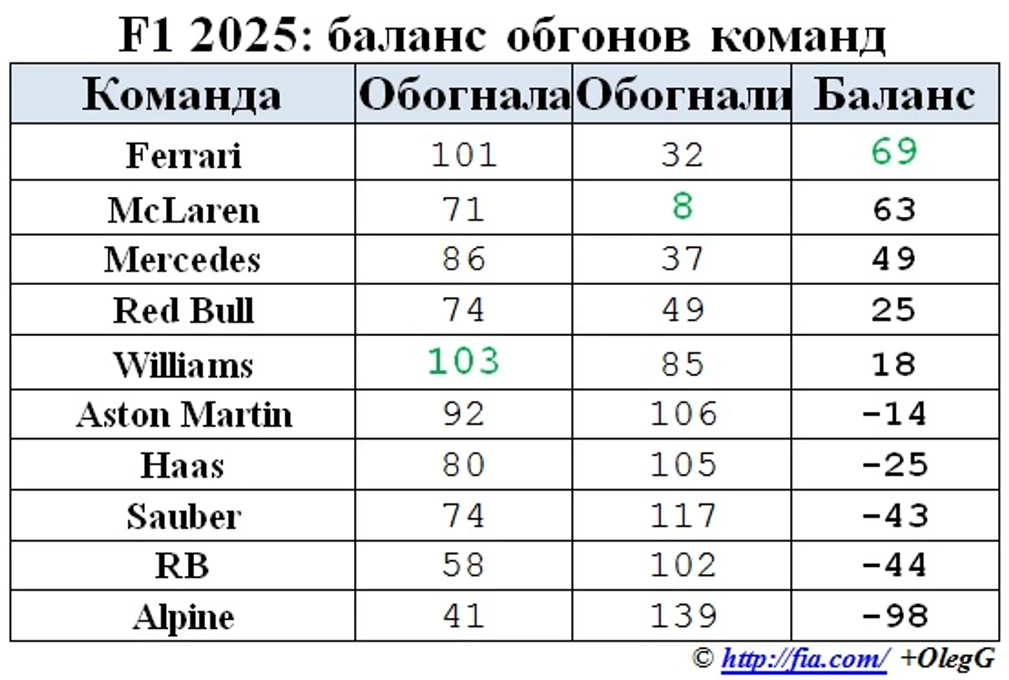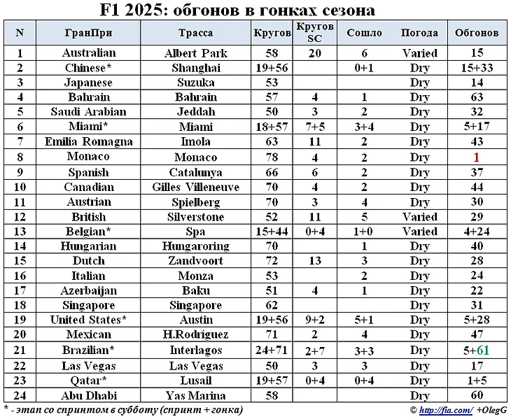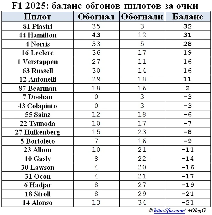 По ходу сезона-2025 после каждой гонки собирал информацию по обгонам. Для этого использовал покруговку гонок с официального сайта ФИА, дополненную информацией из трансляций. Также пригодилась информация о смене шин по ходу гонки с сайта «Пирелли».