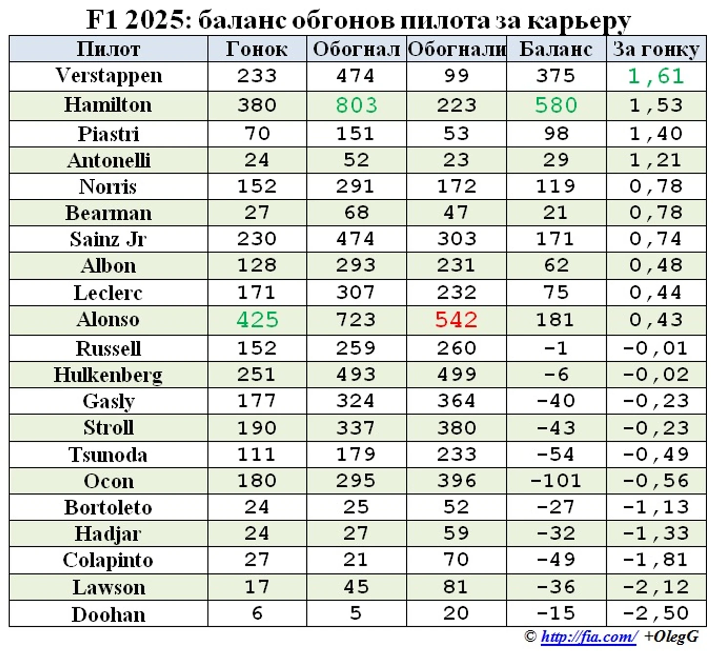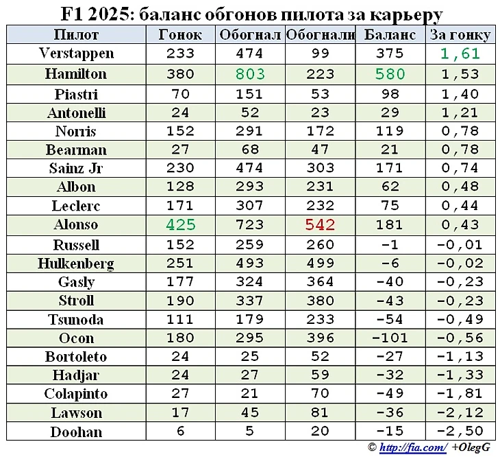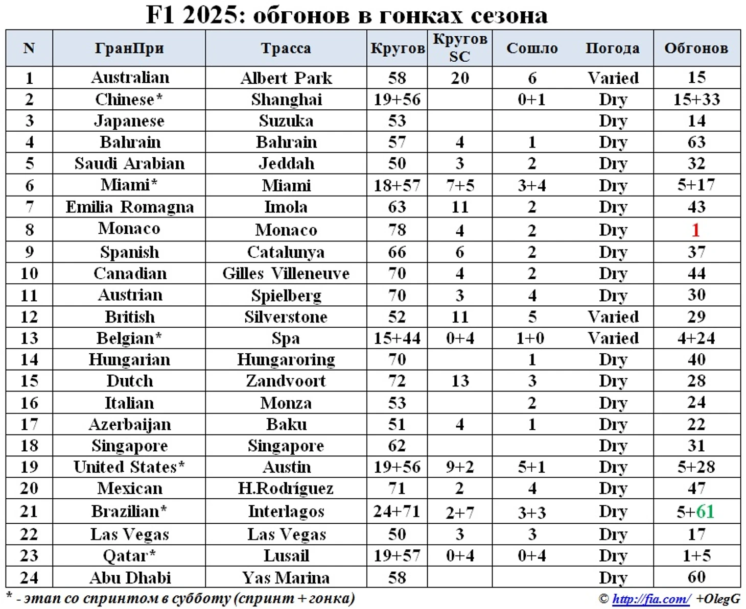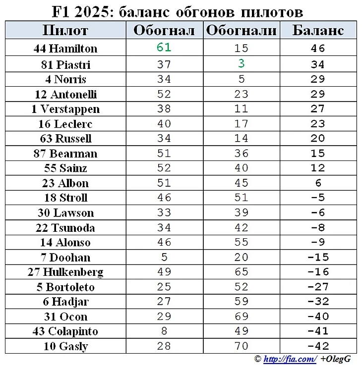 По ходу сезона-2025 после каждой гонки собирал информацию по обгонам. Для этого использовал покруговку гонок с официального сайта ФИА, дополненную информацией из трансляций. Также пригодилась информация о смене шин по ходу гонки с сайта «Пирелли».