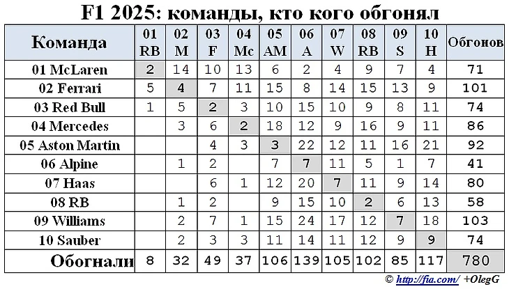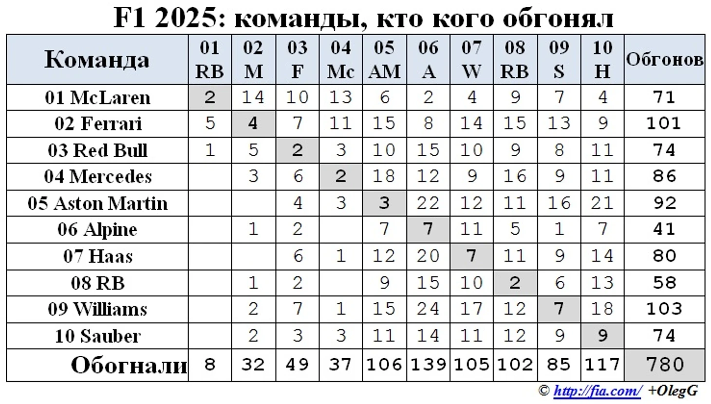 Не трудно догадаться, что в этой таблице по диагонали – «внутрикомандные» обгоны. Естественно, изменение позиций на трассе по указанию командного мостика или требованию стюардов, т.е. без очевидной борьбы напарников по команде, в данную статистику не входят.