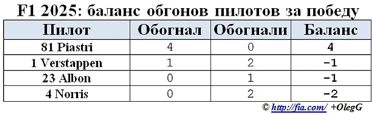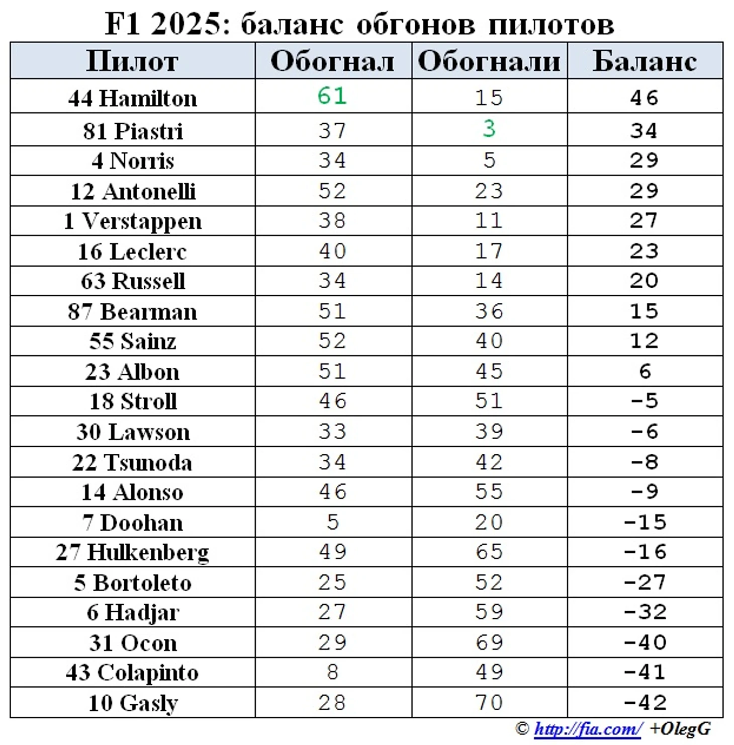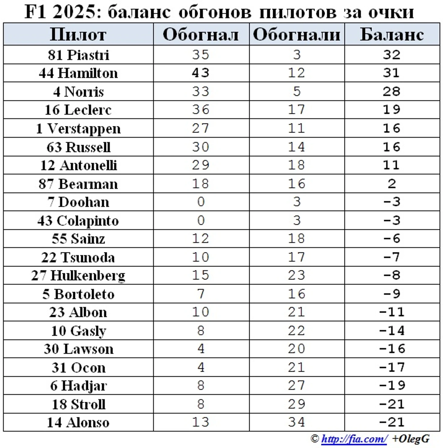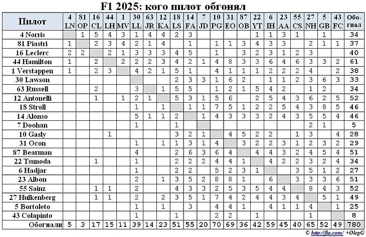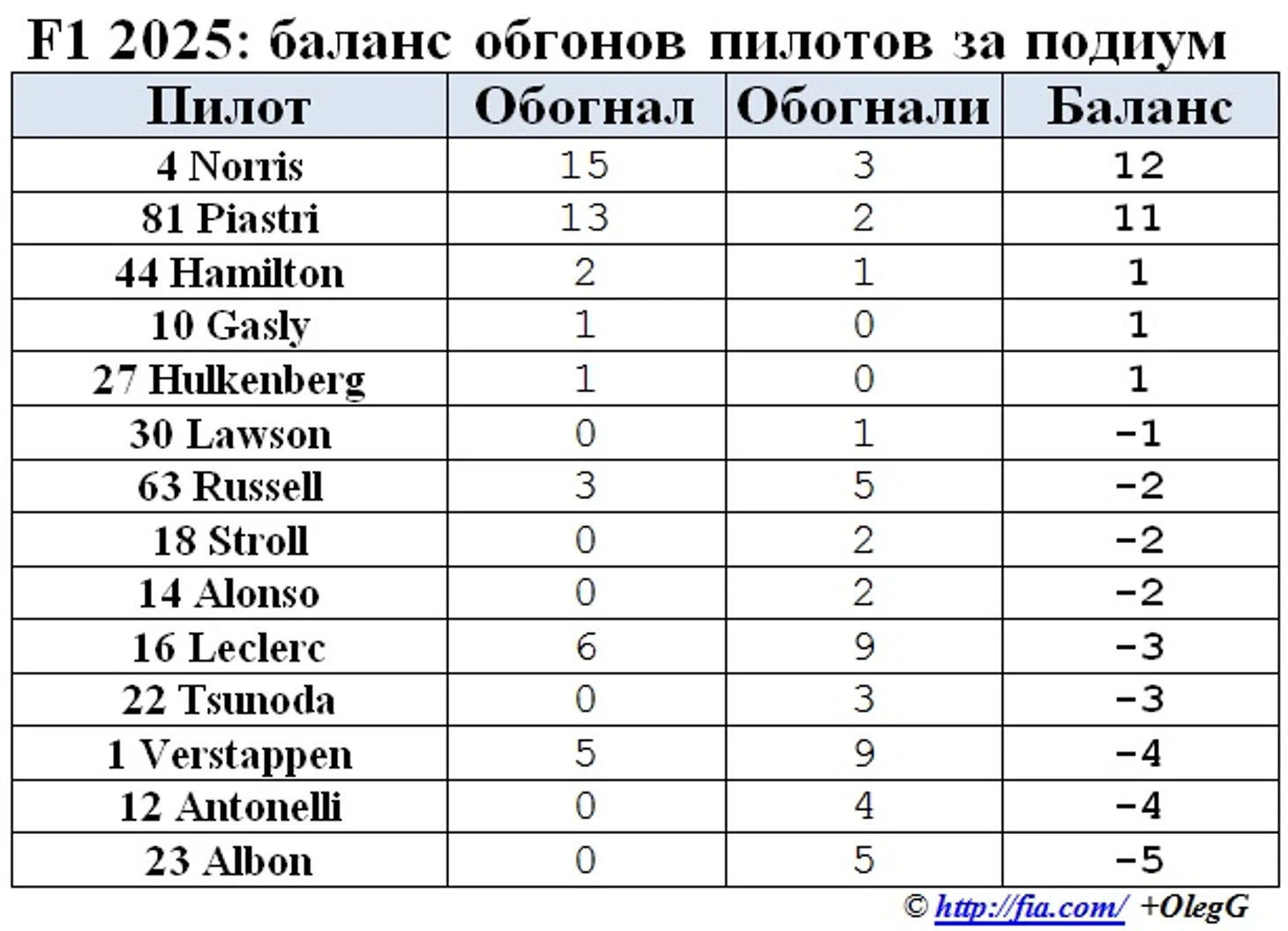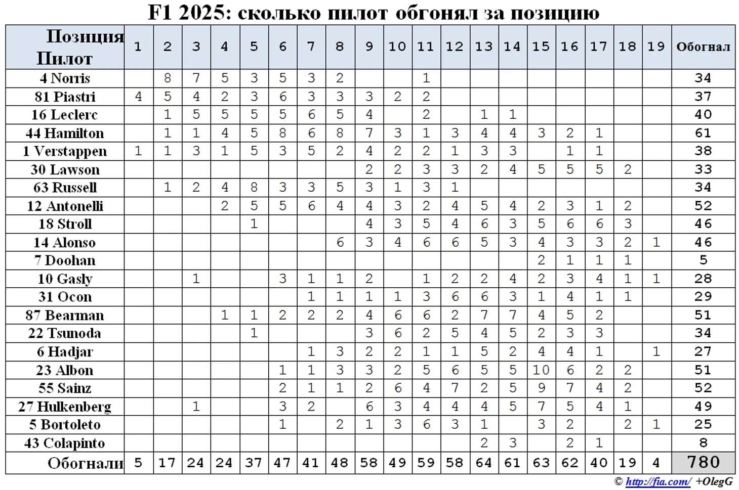 Теперь о том, кого и сколько раз в сезоне пилоты обгоняли: