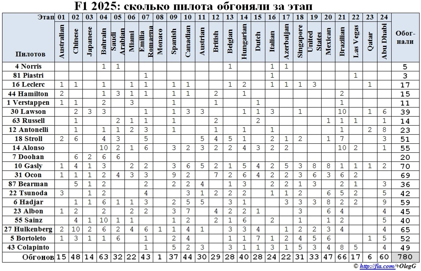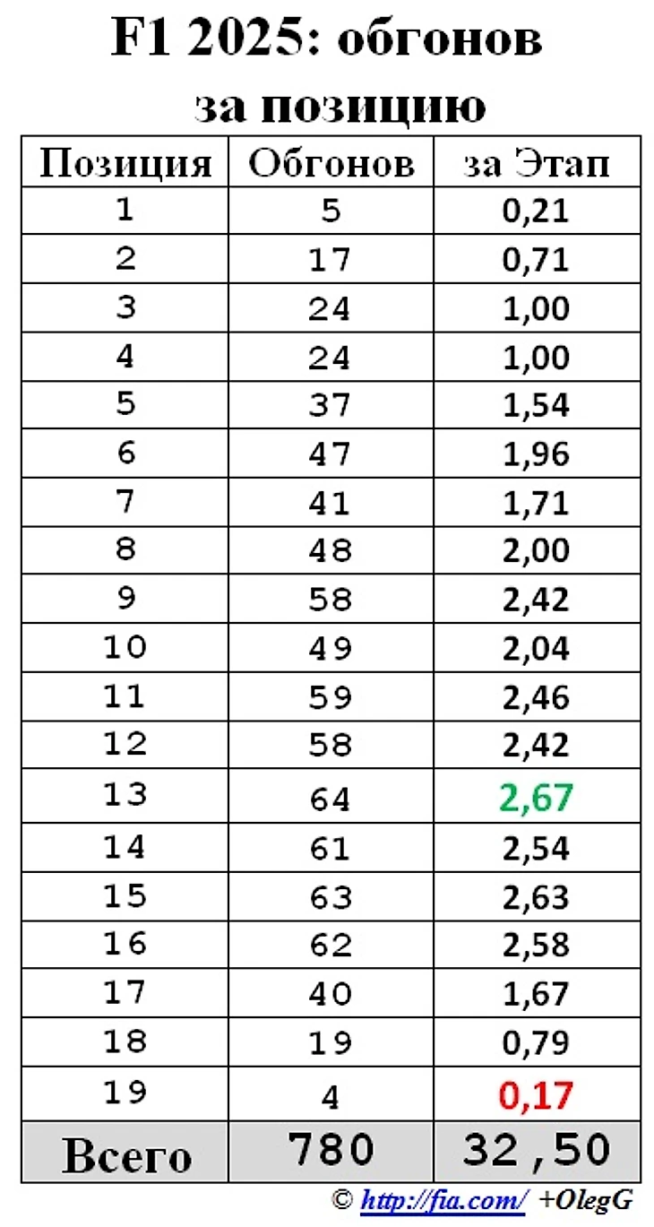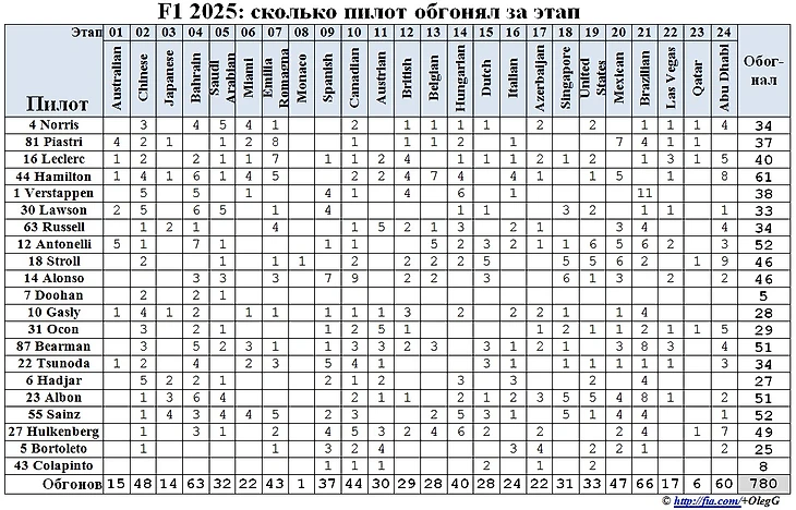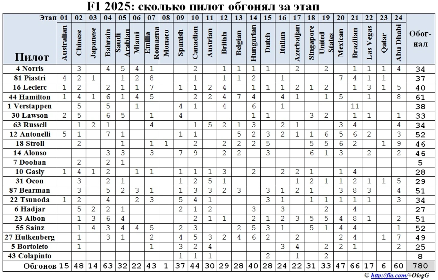 Итак, в сезоне 2025 я насчитал всего 780 обгонов. Из них на основные воскресные гонки приходится 745 обгон, а оставшиеся 35 - обгоны во время 6 субботних спринтов.