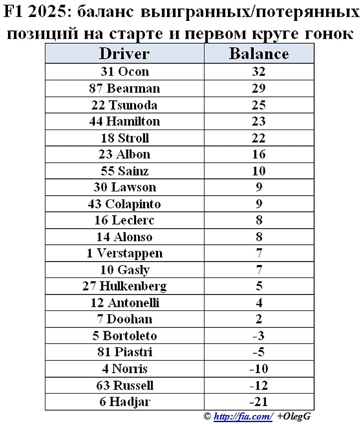 Также, памятуя прошлые дискуссии и интерес к происходящему на первом круге после старта в гонке, приведу статистику выигранных/потерянных позиций пилотами до второго круга: