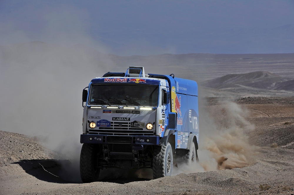 Спортивным экипажам в начале дня также предстояло пересечь Анды, а заодно и аргентино-чилийскую границу. После 522 километров лиазона на преодоление которого было дано всего 7 часов времени, в районе огромного солончака Лагуна Салада был дан старт 302-километрового спецучастка. Большую его часть составляли зоны фэш-фэш. В грузовом зачете борьбу продолжают 51 экипаж. Атакама встретила их высохшими руслами рек и каменистыми участки пустыни. Русла речушек образуются здесь от тающего в горах снега. В некоторых местах, кажется, что почва твердая, сверху лежат мелкие камни, на деле же оказывается что это "пухляк". Колеса вязнут в рыхлой массе, мотор греется. Как рассказывают сами гонщики, если спрыгнуть из кабины можно по пояс оказаться в этой мелкодисперсной пыли напоминающей цемент. Это очень непростые участки для автомобиля. Понятно, что трасса была очень пыльной, но к счастью сильный боковой ветер обеспечивал приемлемую видимость.