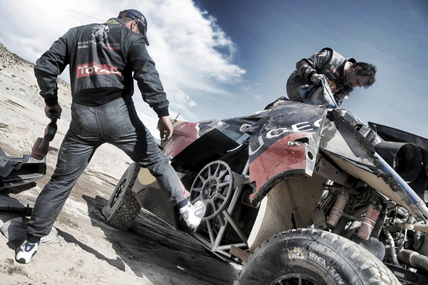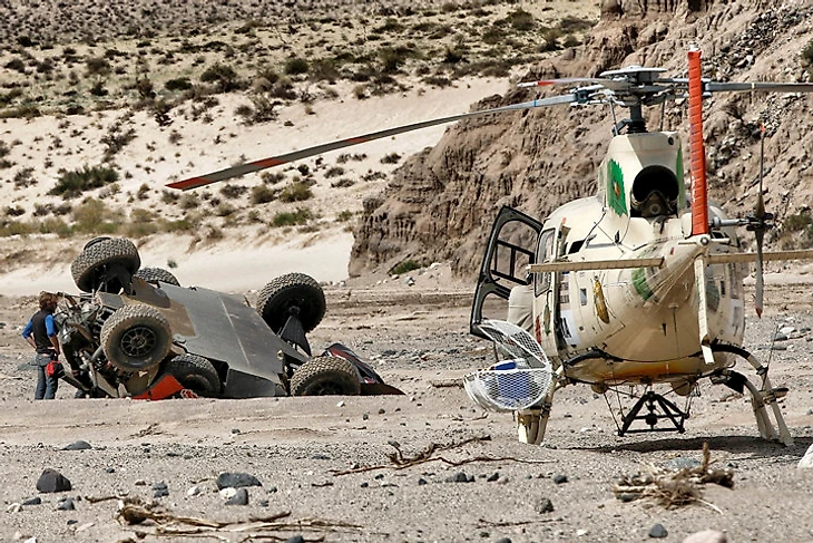 Экипаж россиянина Владимира Васильева проезжал мимо, когда Леб вместе со штурманом Даниэлем Эленой пытались привести свой автомобиль в рабочее состояние.