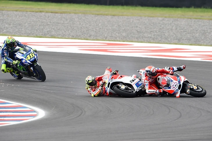После смены мотоциклов ситуация кардинально меняется: Маркес как-будто улетает от всех, а Росси не может найти свой темп на новом байке. Маркес буквально за несколько кругов сделал открыв в 6 секунд, выигрывая на первых кругах по секунде с круга у Росси. При этом самого Росси довольно быстро догоняли конкуренты: Виньялес на Сузуки и обе Дукати. По таймингу было видно, что обгон Росси вопрос времени. Но не зря видимо Росси носит прозвище Доктор, он видимо знает какие-то магические заклинания. Сначала самоликвидируется Виньялес за 3 круга до финиша. Дукати держались дольше, они нагло прошли Росси на предпоследнем круге, казалось все - Росси без подиума. Но того что произошло потом, точно не ждал никто. Вместо того, чтобы вместе доехать до финиша, гонщики Дукати продолжили бороться. Янноне подкатился под Дови и оба улетели в гравий. Представляю реакицю Росси в тот момент. Третьим после такой халявы приехал ни шатко ни валко Педроса. Довициозо же после падения смог докатить свой байк до финиша - итог 13 место вместо подиума ...