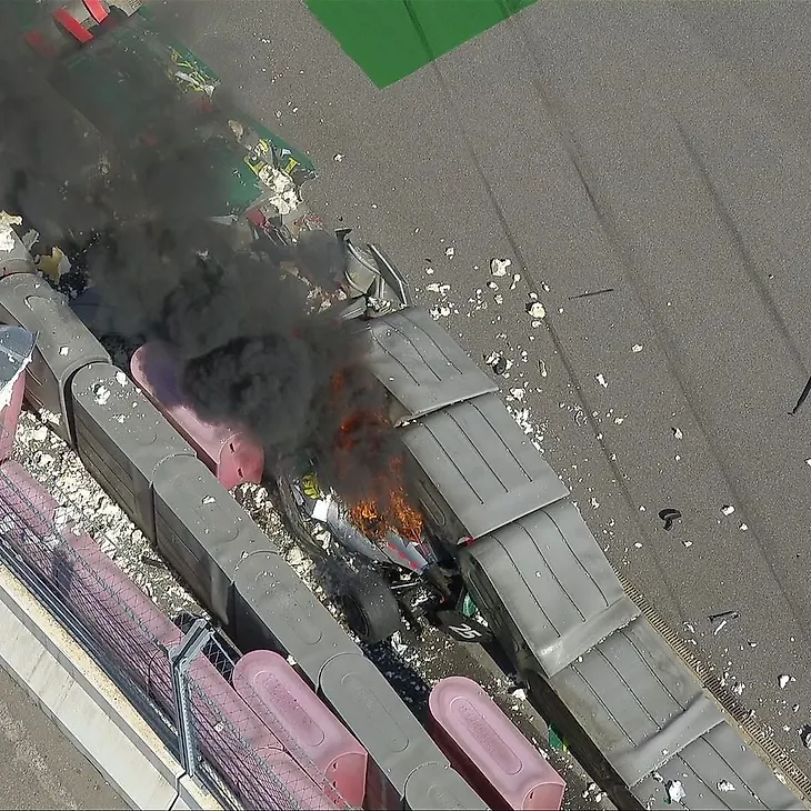 Опасное столкновение в российской гонке «Ф-2» на скорости под 300 км/ч: один болид сгорел, барьеры уничтожены