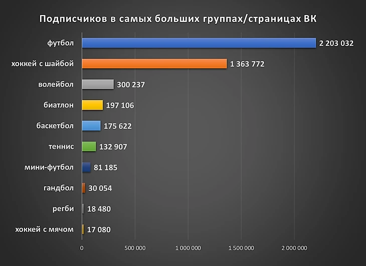 Популярность спорта можно измерять по разному, но мы нашли с нашей точки зрения достаточно объективный способ. В современном мире социальных сетей каждый человек может подписаться на новости по интересам. Мы провели мини-исследование на предмет популярности видов спорта в самой массовой российской социальной сети ВКонтакте. Мы взяли 9 наиболее значимых игровых видов спорта (футбол, хоккей, волейбол, баскетбол, хоккей с мячом, регби, гандбол, теннис, мини-футбол ) и добавили к ним активно раскручиваемый биатлон. В качестве оценки выставлялось количество подписчиков в наибольшей группе или странице посвященных этому виду спорта в сети ВК.