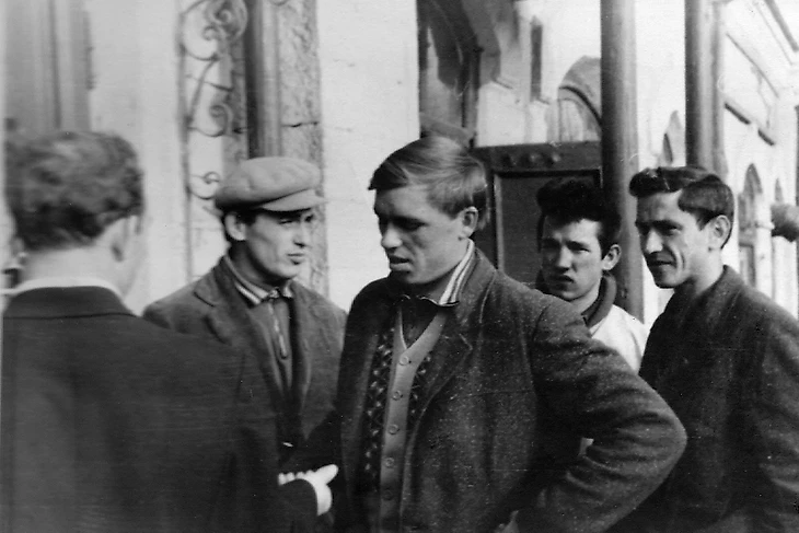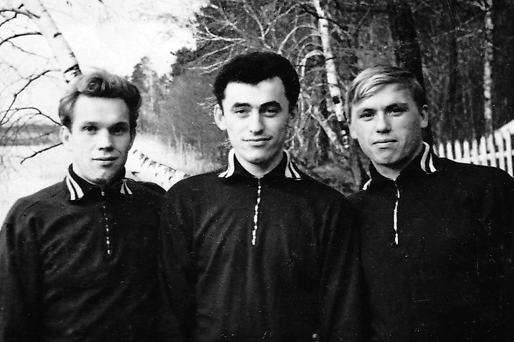 Сезон 1963/1964. Свердловск. Хоккеисты СКА у входа в спортивный клуб армии Уральского военного округа (слева направо): Борис Коломацкий, Юрий Варзин, Виктор Шеховцов