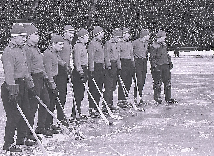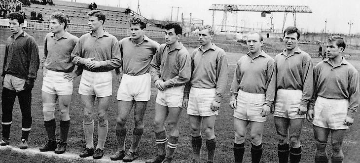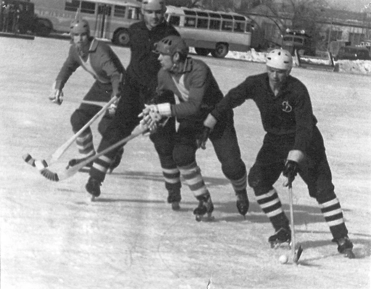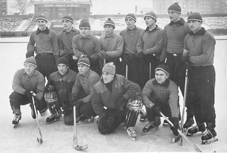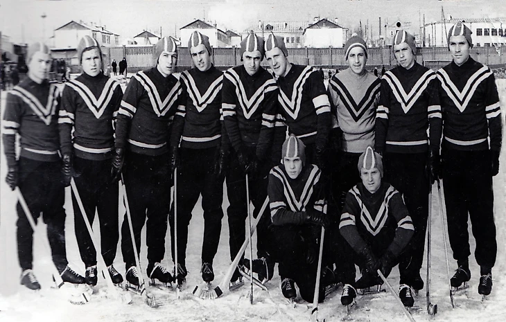 1963. Хоккеисты свердловского СКА перед началом футбольного матча областных соревнований (слева направо): Леонард Мухаметзянов, Юрий Коротков, Олег Катин, Виталий Симонов, Борис Коломацкий, Юрий Варзин, Александр Измоденов, Герман Тарасевич, Валентин Хардин