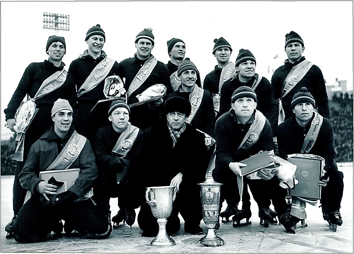14 марта 1961. Свердловск. Сборная Свердловской области — победитель II зимней Спартакиады народов РСФСР. На фото слева направо: Анатолий Голубев, Валентин Хардин, Николай Дураков, Николай Назаров, Александр Измоденов, Герман Тарасевич, Юрий Варзин, Виктор Шеховцов, Юрий Коротков, Юрий Школьный