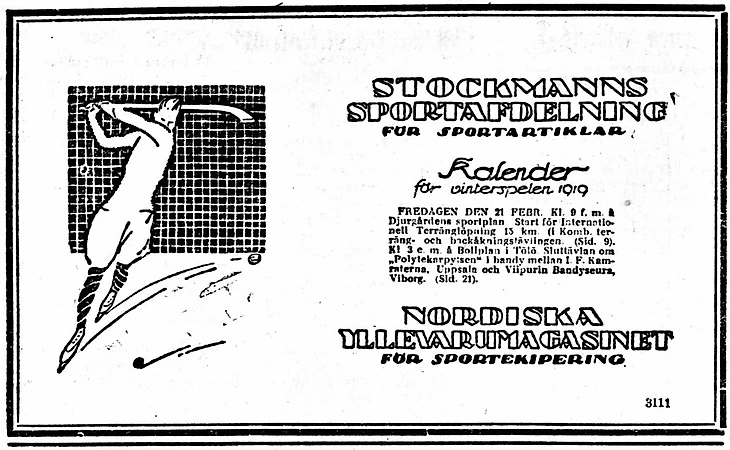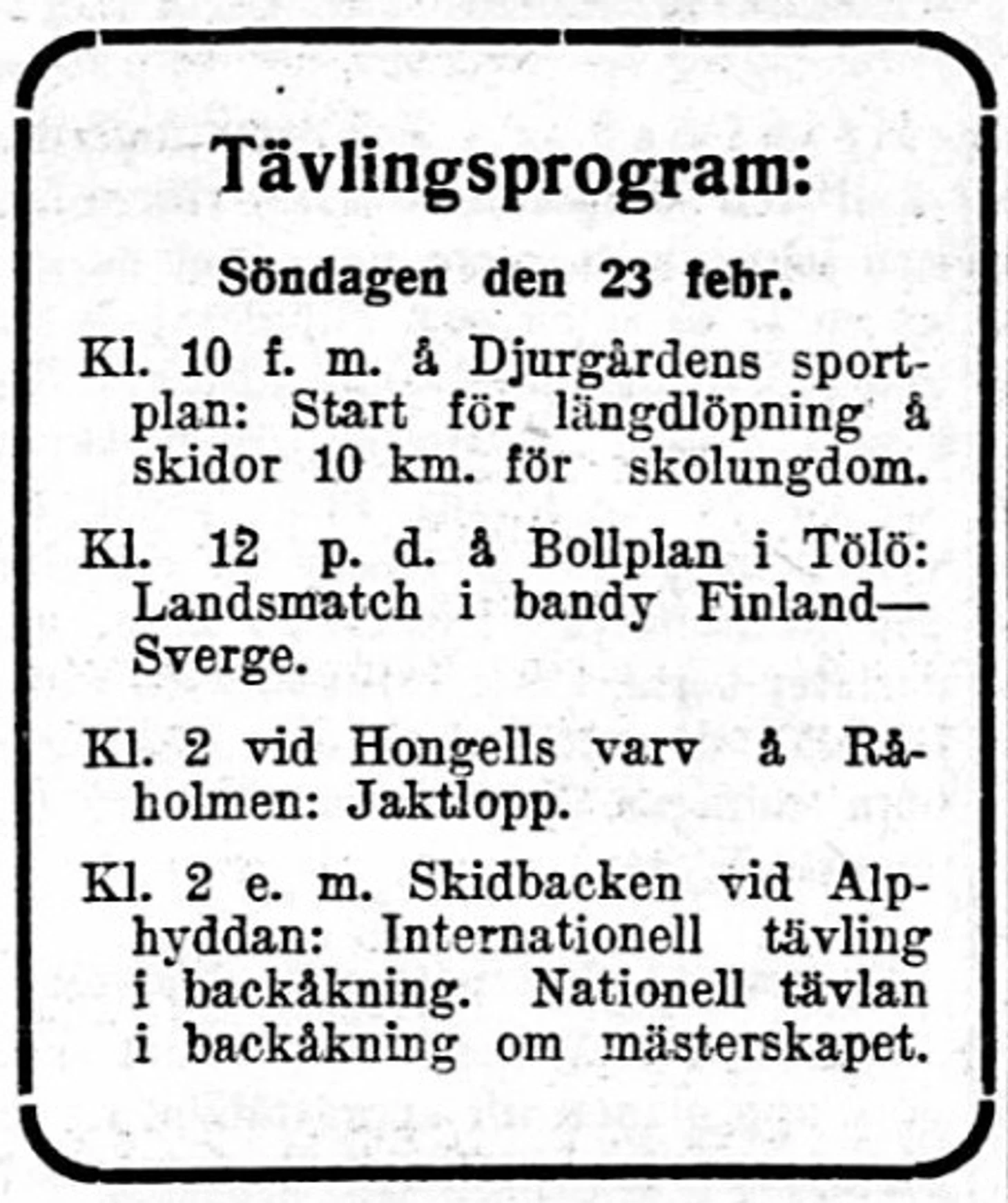Анонс воскресных соревнований «Финских зимних игр», в том числе игры между хоккейными сборными Финляндии и Швеции на стадионе «Тёёлён паллокенття» из газеты «Хювюдстадсбладет» за 23 февраля 1919 года