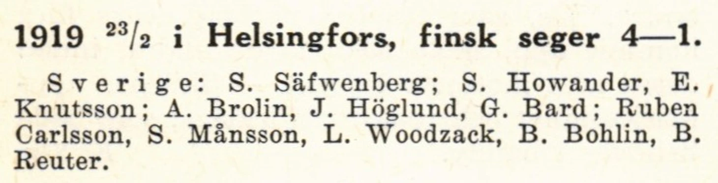 23 февраля 1919 года. Хельсинки. Стадион «Тёёлён паллокенття». Товарищеский матч. Финляндия - Швеция - 4:1 (2:1). Состав сборной гостей (I том «Энциклопедии по спорту, гимнастике и жизни на природе», серия «Скандинавская семейная книга», Стокгольм, 1938 год)