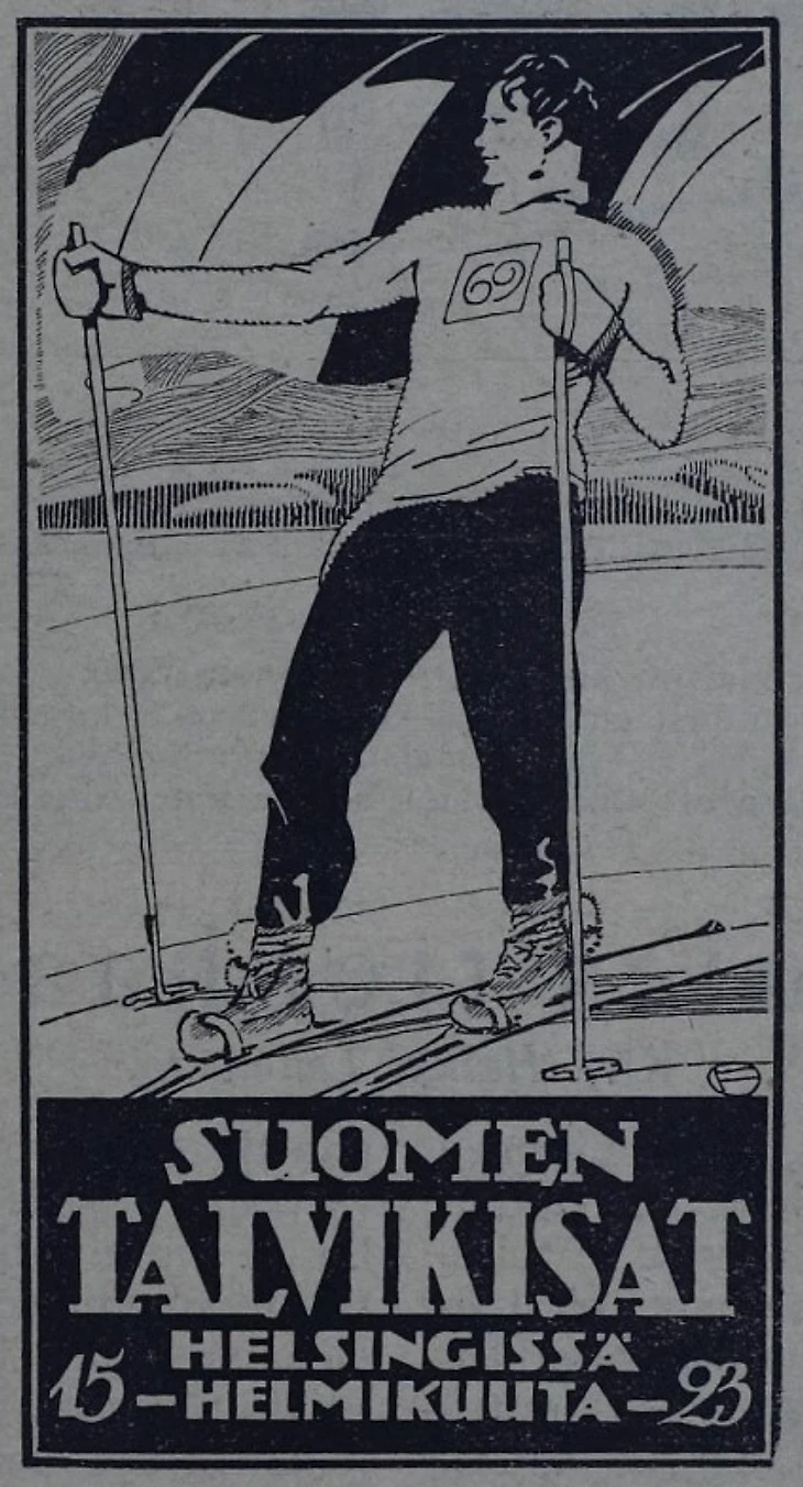Плакат «Финских зимних игр», проходивших в Хельсинки с 15 по 23 февраля 1919 года, нарисованный художником О. Фурухьельмом (O. Furuhjelm) / из журнала «Суомен урхейлулехти»