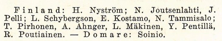 Запасные: [вратарь] Г. Бьёркенхайм / G. Björkenheim (КИФ, Хельсинки), Гарофф / Garoff («Камратерна» (ИФК), Хельсинки), Сегер / Seger («Камратерна» (ИФК), Хельсинки), Эклеф / Eklöf («Камратерна» (ИФК), Хельсинки), Виберг / Wiberg («Камратерна» (ИФК), Хельсинки), Торн / Thorn (КИФ, Хельсинки)».