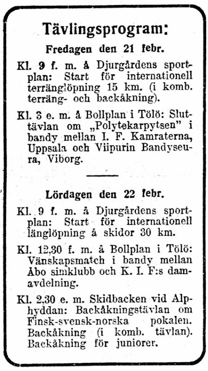 Программа соревнований «Финских зимних игр» на 21 и 22 февраля из крупнейшей шведоязычной газеты Финляндии «Хювюдстадсбладет» за 21 февраля 1919 года, включающая в себя кубковый матч «Камратерна» (Упсала, Швеция) - «Виипурин» (Выборг, Финляндия) и товарищескую встречу женских команд АСК (Турку) - КИФ (Хельсинки)