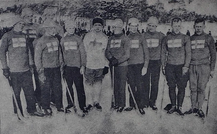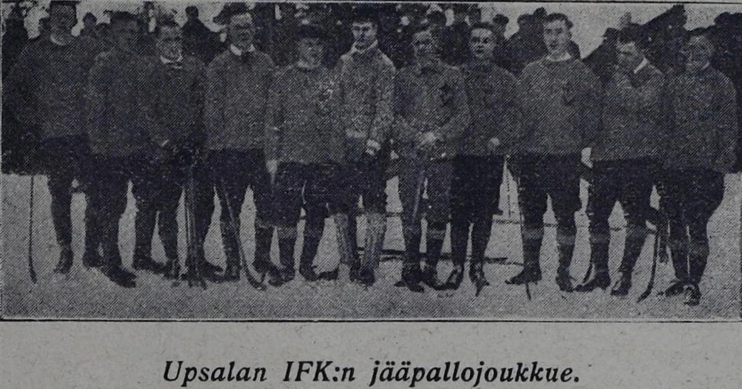 21 февраля 1919 года. Хельсинки. Хоккейная команда «Камратерна» (ИФК) из Упсалы, базовый клуб сборной Швеции, обладатель Политехнического кубка 1919 года (фото из журнала «Суомен урхейлулехти» № 9 от 4 марта 1919 года)