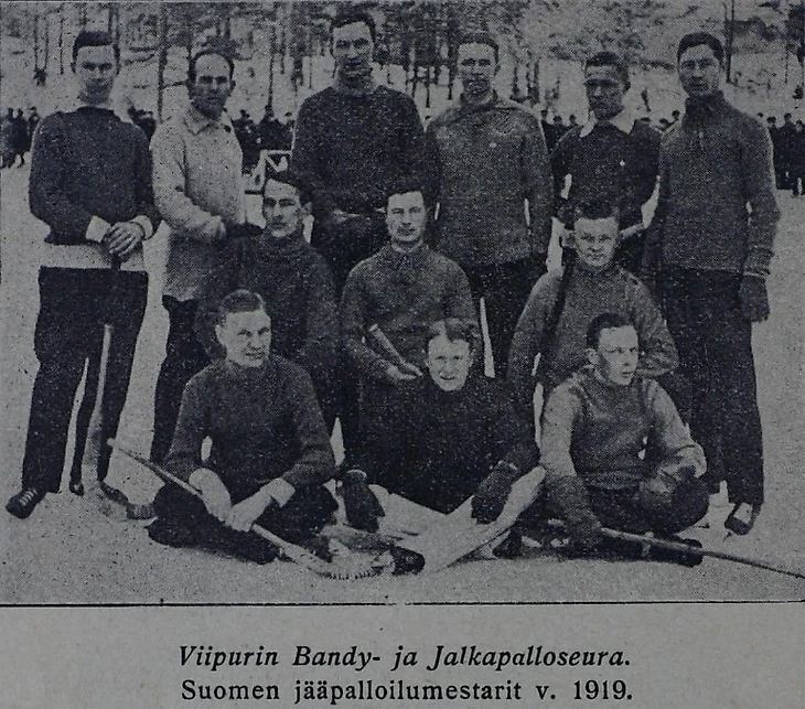 Чемпион Финляндии SPL по хоккею с мячом 1919 года - «Виипурин бандисеура». «Волки» из Выборга выиграли этот титул 2 марта (фото из журнала «Суомен урхейлулехти» № 10 от 11 марта 1919 года)