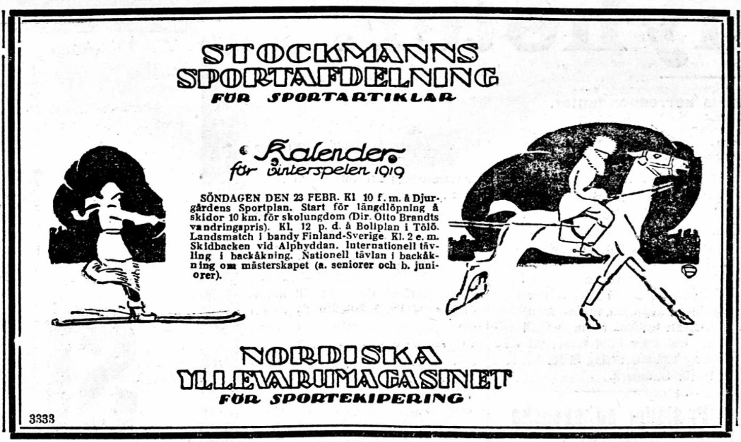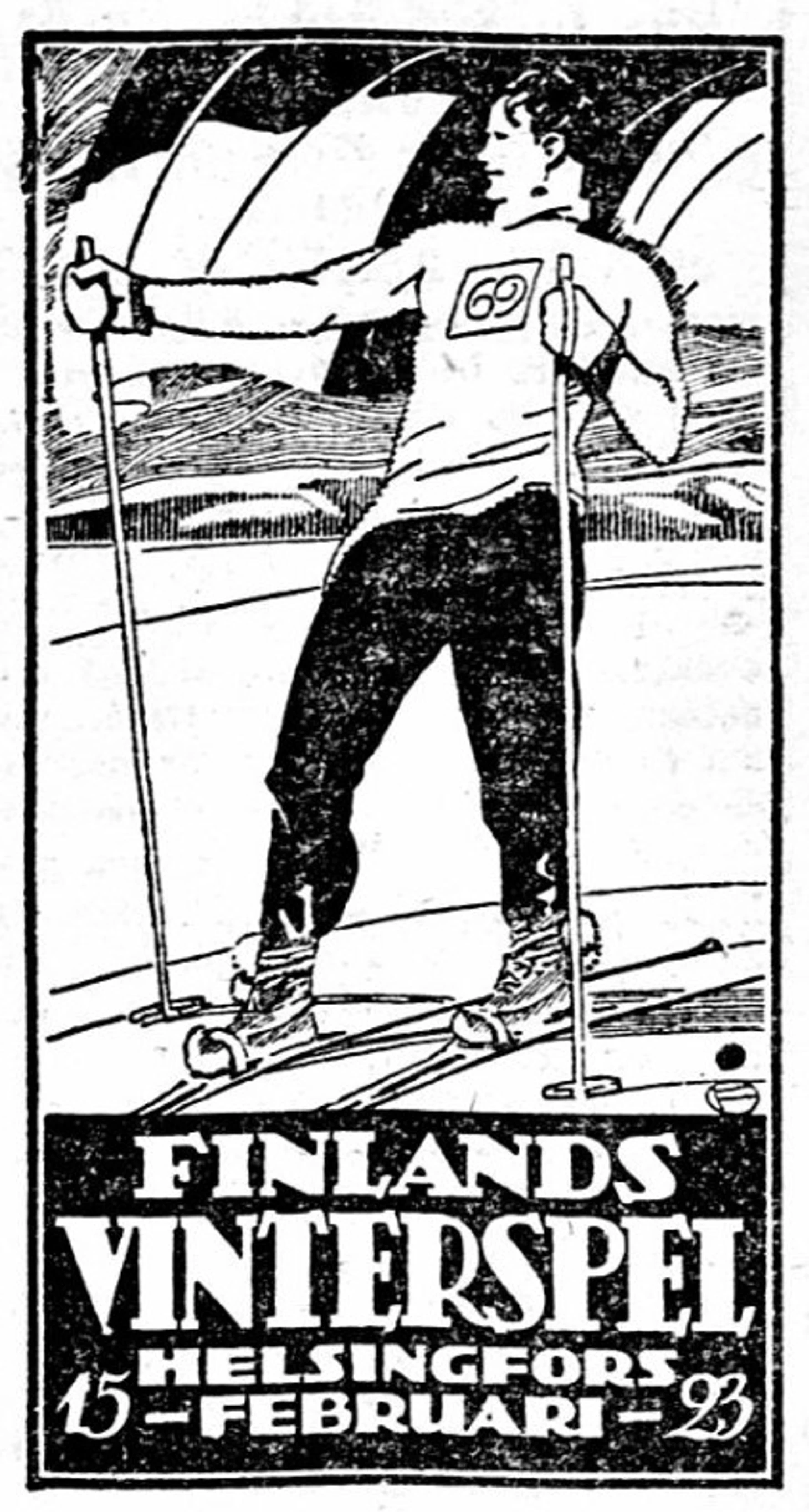 Плакат «Финских зимних игр» (на шведском языке), проходивших в Хельсинки с 15 по 23 февраля 1919 года, нарисованный художником О. Фурухьельмом (O. Furuhjelm) / из газеты «Хювюдстадсбладет»