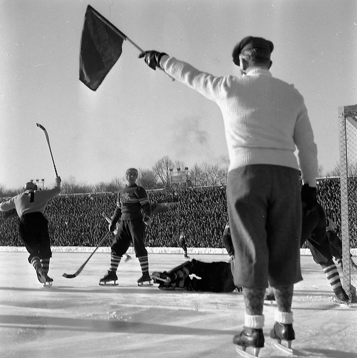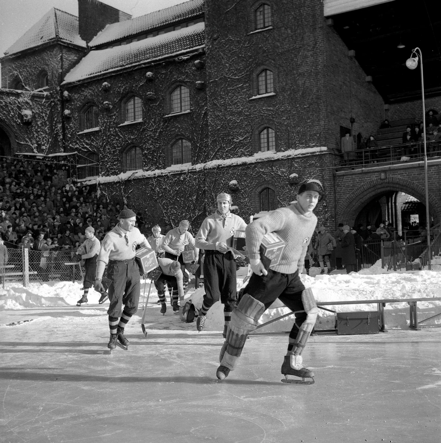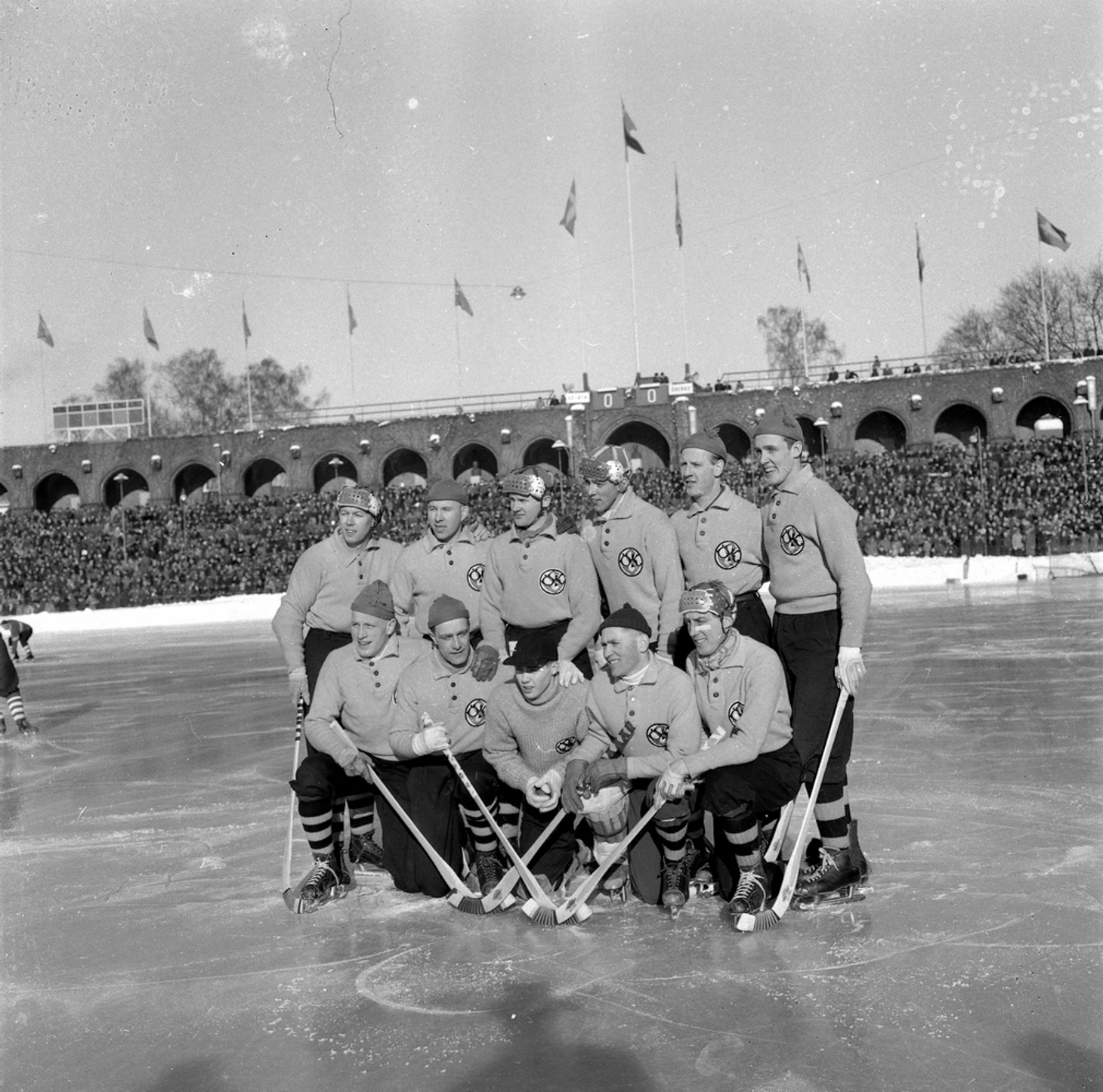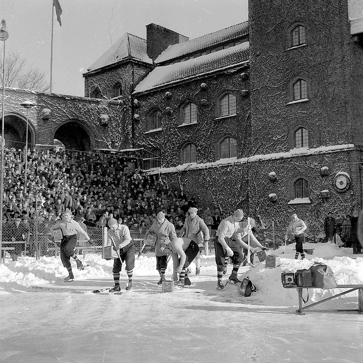 20 февраля 1955 года. Стокгольм. Олимпийский стадион. 22 182 зрителя. - 15°C. Финал чемпионата Швеции. «Эребру» - «Эдсбюн» - 7:1 (5:1). «Эребру» во главе с вратарем Гуннаром Рингом выкатываются на церемонию открытия финального матча (digitaltmuseum.se)