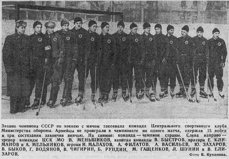 12 марта 1955 года. Иваново. Хоккеисты ЦСК МО - чемпионы Советского Союза (газета «Советский спорт» № 34 от 17 марта 1955 года)