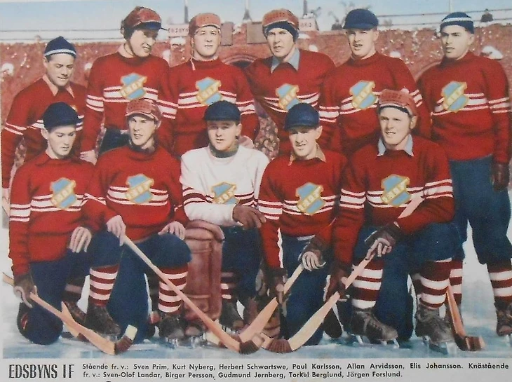 20 февраля 1955 года. Стокгольм. Олимпийский стадион. 22 182 зрителя. - 15°C. Финал чемпионата Швеции. «Эребру» - «Эдсбюн» - 7:1 (5:1). Хоккеисты «Эдсбюн» перед матчем (верхний ряд слева направо): правый крайний нападающий Свен Прим/Sven Prim, правый полусредний нападающий Курт Нюберг/Kurt Nyberg, центральный полузащитник Герберт Свартсве/Herbert Swartswe, центральный нападающий Пауль Карлссон/Paul Karlsson, левый полусредний нападающий Аллан Арвидссон/Allan Arvidsson и левый крайний нападающий Элис Йоханссон/Elis Johansson; (нижний ряд слева направо): левый полузащитник Свен-Улоф Ландар/Sven-Olof Landar, левый защитник Биргер Перссон/Birger Persson, вратарь Гудмунд Йернберг/Gudmund Jernberg, правый защитник Торкель Берглунд/Torkel Berglund и правый полузащитник Йорген Форслунд/Jörgen Forslund (спортивный журнал для шведской молодежи «Рекорд» № 18 от 28 апреля 1955 года)
