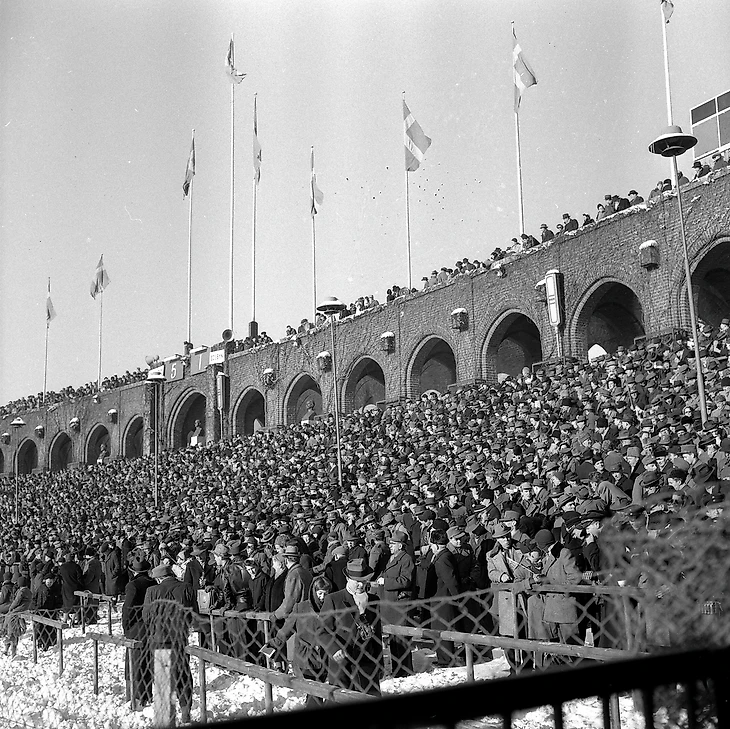 20 февраля 1955 года. Стокгольм. Олимпийский стадион. 22 182 зрителя. - 15°C. Финал чемпионата Швеции. «Эребру» - «Эдсбюн» - 7:1 (5:1). Трибуны в перерыве (digitaltmuseum.se)