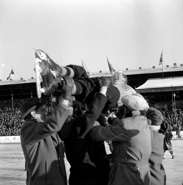 20 февраля 1955 года. Стокгольм. Олимпийский стадион. 22 182 зрителя. - 15°C. Финал чемпионата Швеции. «Эребру» - «Эдсбюн» - 7:1 (5:1). Качают героя матча, автора четырех голов, левого полусреднего нападающего «Эребру» Карла-Эрика Сёдергрена. Защита «Эдсбюна» весь матч плотно опекала главную ударную силу «Эребру» правого полусреднего Улле Сээва, а также центрфорварда Уве Эйдхагена, развязав руки, действовавшим на левом фланге, Карлу-Эрику Сёдергрену и Йёсте Кильгорду (digitaltmuseum.se)