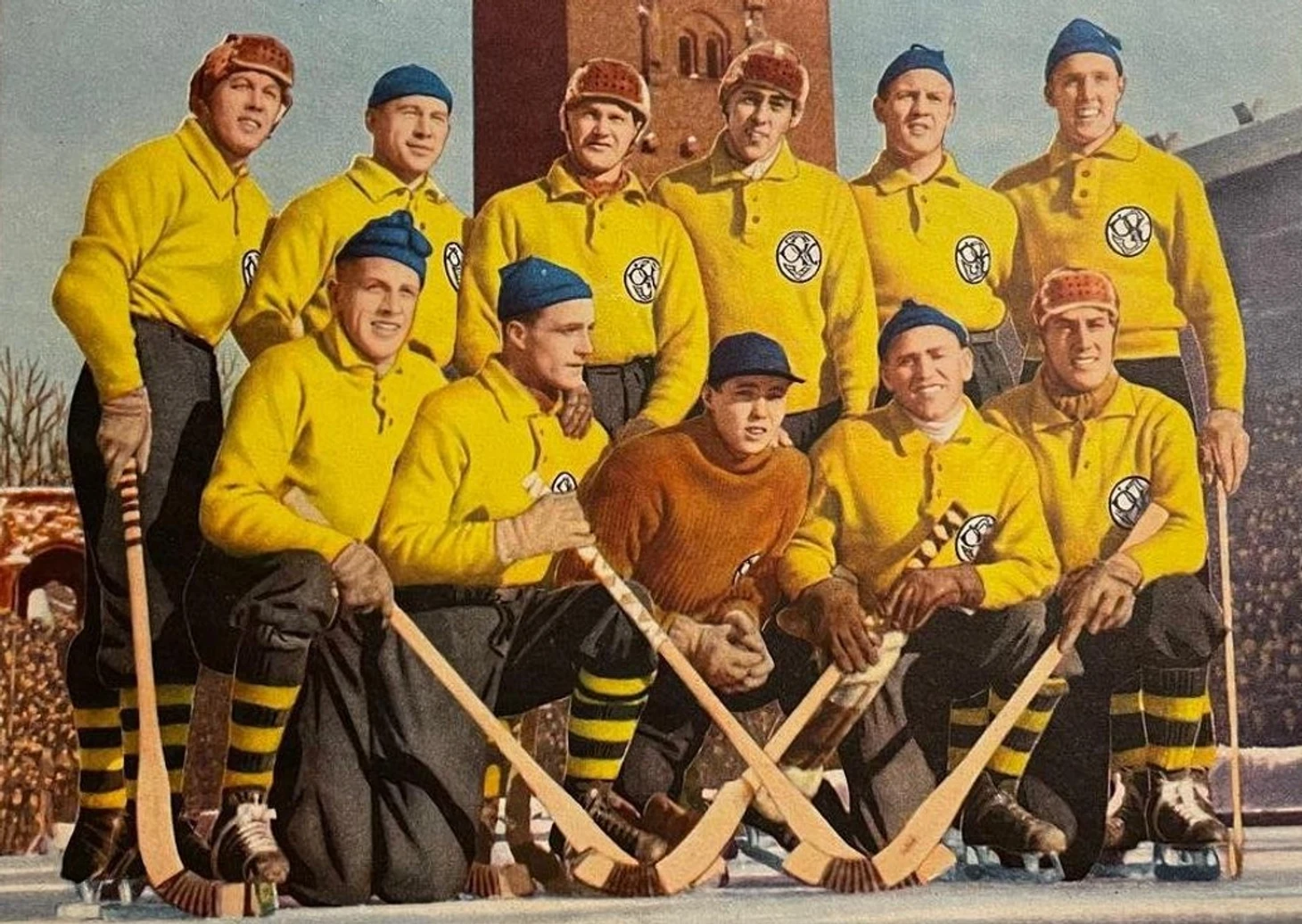 20 февраля 1955 года. Стокгольм. Олимпийский стадион. 22 182 зрителя. - 15°C. Финал чемпионата Швеции. «Эребру» - «Эдсбюн» - 7:1 (5:1). Будущие победители перед игрой (верхний ряд слева направо): Таге Магнуссон/Tage Magnusson, Улле Сээв/Olle Sääw, Уве Эйдхаген/Ove Eidhagen, Свен-Оке Эриксон/Sven-Åke Erixon, Карл-Эрик Сёдергрен/Karl-Erik Södergren и Йёста Кильгорд/Gösta Kihlgård; (нижний ряд слева направо): Оке Петтерссон/Åke Pettersson), Ивар Йоханссон/Ivar Johansson, Гуннар Ринг/Gunnar Ring, Руне Бергер/Rune Bergner и Свен Бергстрём/Sven Bergström (digitaltmuseum.se)