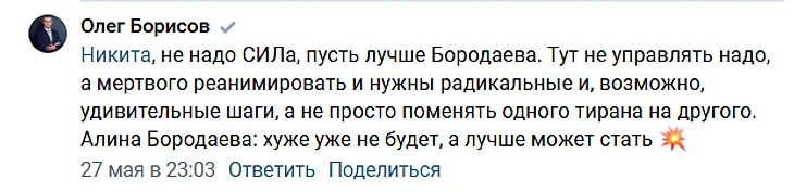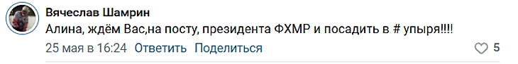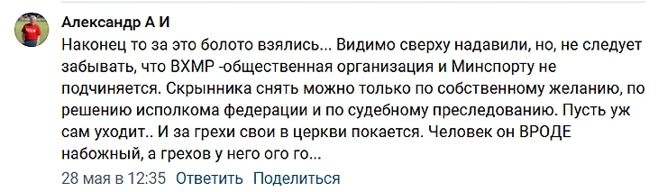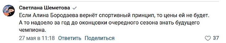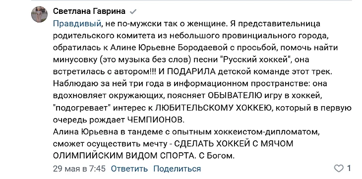 Конечно, люди отмечают и минусы Бородаевой. Например, факт того, что она является женщиной, которые ранее в России никогда не руководили хоккейными федерациями.