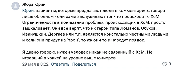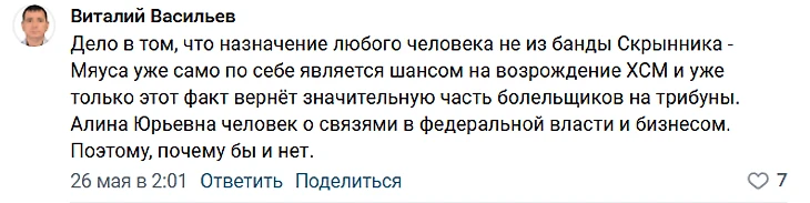 А дальше начинается самое интересное. Кто же должен прийти на смену Скрыннику? Мнения «за» есть за всех трех обозначенных нами кандидатов – Сергея Ломанова-старшего, Сергея Мяуса и Алину Бородаеву. В то же время многие считают, что новым президентом ФХМР должен стать человек новый, не игравший в русский хоккей на высоком уровне, не работавший во всероссийской федерации при Скрыннике и не трудившийся в клубах.