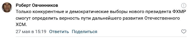 Значимый вопрос, волнующий общественность, заключается и в том, каким образом новый президент ФХМР придет к власти. Его назначат в рамках потенциальных реформ в мире российского спорта или он будет избираться? Если избираться, то будут ли эти выборы реально конкурентными и честными или Скрынник просто прикажет сотрудникам федерации голосовать за определенного кандидата? Вопросы.