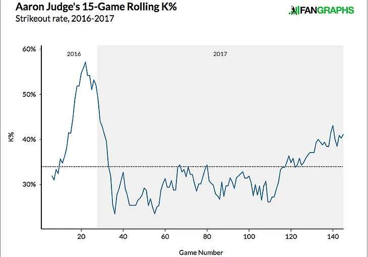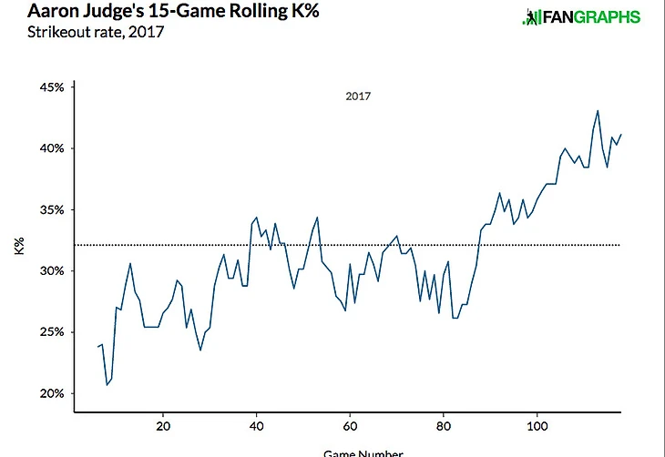Ось ординат обоих графиков даёт нам ещё некоторые поводы для успокоения. После прохождения дна, его показатель wRC+ подскочил выше 100, что является средним показателем по Лигам. Его показатель ISO после резкого падения также устаканился и движется в диапазоне .200-.300 последние игр 20. Да, эти цифры далеки от показателей Джаджа в первой половине сезона, но они показывают, что уровень его выровнялся и он больше не показывает игру, достойную разве что для независимых лиг. Действительно, если вы присмотритесь к графикам, то увидите зачатки возвращения к нормальной форме.
