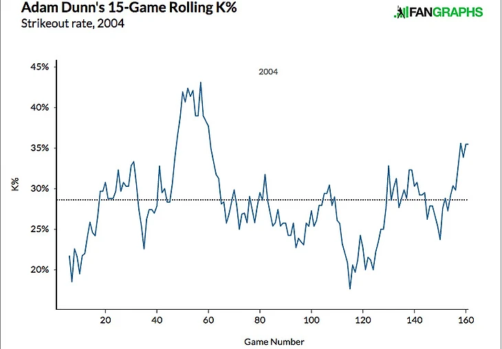 Это должно помочь смягчить панику по поводу игры Аарона во второй половине сезона. Да, обидно спускаться с небес на землю (а то и ниже), и он должен внести коррективы в свою игру, но: 1) В его спаде нет ничего беспрецедентного, кроме его страйк-аут серии. 2) Он уже вносил изменения, позволившие резко сократить K% в сравнении с прошлым сезоном, что даёт повод думать, что он сможет сделать это снова. И если вы говорите, что эта серия чёрная метка на его будущее, то я могу сказать, что концентрируясь на этом, вы можете просмотреть что-то не менее историческое.