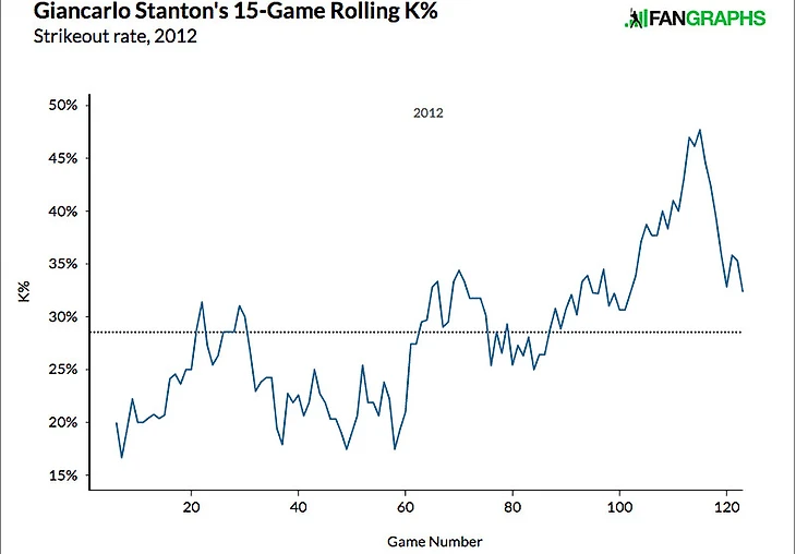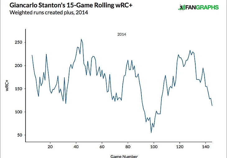 Могучий Траут имел такой же серьёзный спад во второй половине сезона, какой наблюдался у Джаджа. После короткого пребывания на среднелиговом уровне его wRC+ к концу сезона снова пошёл к заоблачным значениям. Тот год он закончил с показателями 172 wRC+ и 9.0 fWAR. Неудачный стрик после перерыва на звёздный уик-энд не убил его сезон. И это не случайность, приключившаяся лишь раз: и в 2014, и в 2016 годах он имел серьёзные просадки относительно своего уровня, хотя и в разные моменты сезона.