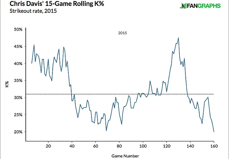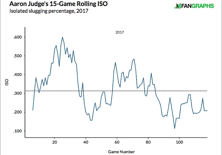 По графикам видно, что оба показателя (wRC+ и ISO) сильно проседают после 80 игры. Однако стоит вспомнить, что это падение происходит с очень высокой планки: в первой половине сезона он имел ДВА(!!!) 15-матчевых стрика с показателем 250 wRC+ и 197 wRC+ общим. Возможно даже более удивителен тот факт, что в апреле у него был показатель ISO .600. Никто не может держать эти показатели на таком уровне (или бейсбол можно было бы закрывать). Не смог и Аарон.