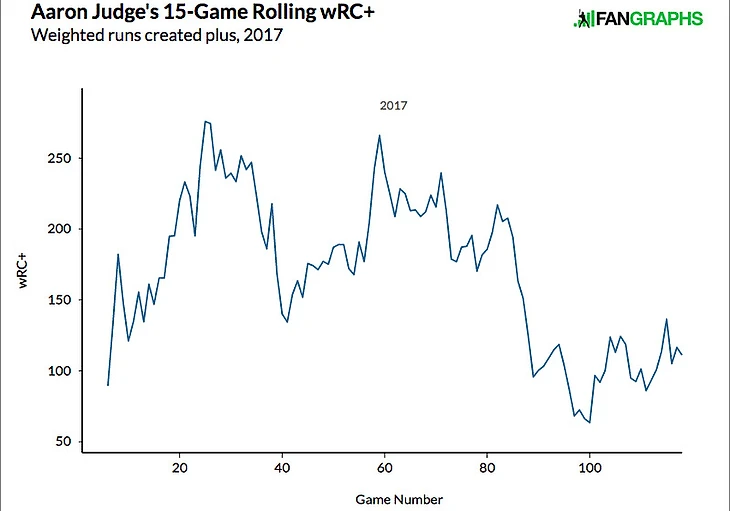 Конечно, всё это не значит, что Джадж сможет вернуться на прежние позиции: ему нужно внести в свою игру на бите необходимые коррективы (и его последние показатели wRC+ вроде как намекают, что они сделаны и он движется в правильном направлении). Эти графики говорят о том, что уровень игры даже лучших из лучших имеет свойство широко колебаться от «это лучший игрок в истории» до «если бы не контракт, мы бы тебя выгнали».