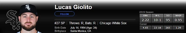 Проводящий всего лишь четвертый сезон в MLB Лукас Джолито является пока главным откровением нынешнего чемпионата, причем без каких-либо преувеличений. Выбранный под 16-м номером Драфта-2012 талантливый подающий, провел четыре года в фарм-системе Нэшнлс, после чего был обменен уже спустя год в мэйджоре - подобное могло бы сломить даже самые стальные нервы, но не в данном случае. Лукас не просто раскрылся в качестве стабильного питчера стартовой ротации, а возглавил ее уже в 24-летнем возрасте! Джолито лидирует в MLB по такому неходовому статистическому показателю, как процент выигранных матчей от общего количество начатых в старте игр - никто в этом сезоне не завершал 77% стартов итоговой победой в десижн (10 из 13). Ближайший к Лукасу по данному показателю его ближайший преследователь в гонке.