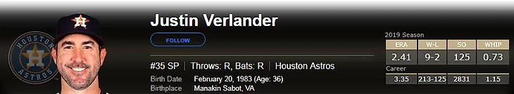 Годы идут, сменились целые поколения звезд прошлого, а Верландер продолжает держать марку одного из сильнейших питчеров в истории бейсбола. Джастин проводит 15-й сезон в мэйджоре и его фаст-бол немного потерял в остроте и скорости. Если в легендарном 2011 году, когда питчер собрал в одном сезоне призы MVP и Cy Young Американской Лиги (в составе Детройта), его максимальная скорость фаст-бола достигала 102.5 миль/час, то на данный момент отметка в 100+ миль/час лидеру ротации Астрос не покоряется уже на протяжении двух лет. Однако, это не мешает Верландеру использовать свой бейсбольный IQ, используя в большей мере слайдер и керв-бол. Результат подобных коррективов в работе питчера на лицо - Джастин лидирует с большим запасом во всей MLB по таким важнейшим статистическим показателям как AVG (.150) и WHIP (.73). Забавнее всего наблюдать моменты в концовках большинства противостояний Верландера с очередным беттером, когда отбивающие после очередного страйк-аута покидают поле без какой-либо злобы и с явным выражением на лице: "Ну что же тут поделаешь..."