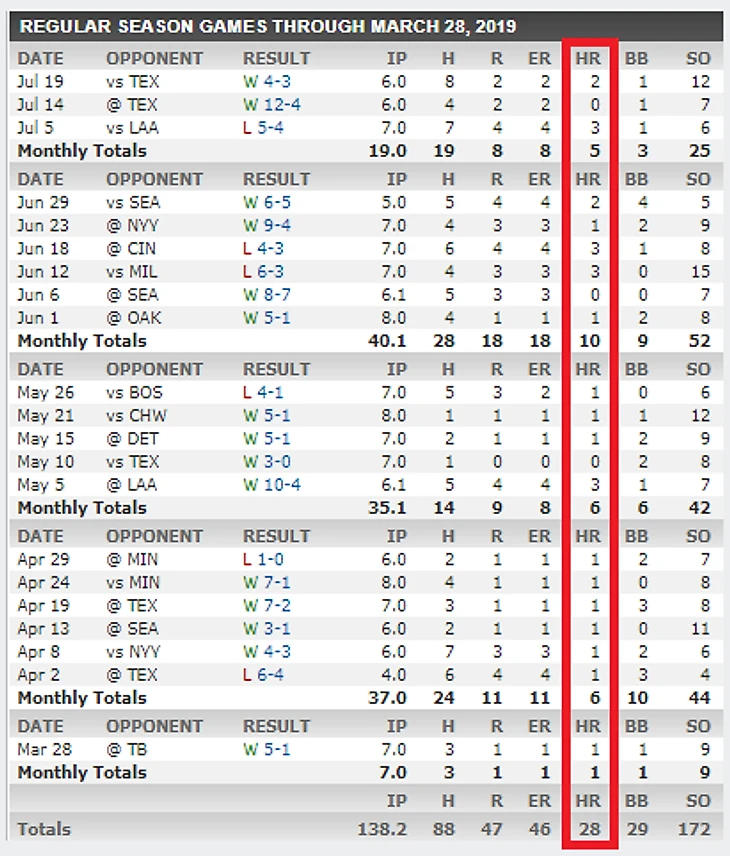 Надо признать, что ситуация Джастина Верландера с пропущенными хоум-ранами не то чтобы совсем тревожная, но таки требовала от питчера конструктивного комментария. Однако, мало кто ожидал, того что конструктив коснется стольких участников как самой лиги, так и связанных с ее деятельностью персонажей. Питчер Хьюстона за 14 сезонов в MLB, вплоть до текущего, пропускал в среднем 0,65 хоум-рана за матч (419 матчей, 272 хоум-рана), что довольно немало, но вполне сносно при демонстрируемом уровне контроля подач и скорости фастбола. Текущий сезон вынудил Джастина позволить 28 раз отбивающему беззаботно отправиться на пробежку в дом, выходя в старте 21 раз (1.33 за матч). Путем нехитрых математических вычислений выясняется, что претендуя всерьез на награду AL Sy Young Верландер более чем в два раза увеличил пропускаемость в данном компоненте! Лишь легендарная работа с отличным контролем сразу нескольких подач и поддержка защиты команды позволяют питчеру лидировать в MLB по AVG и WHIP, удерживая общую пропускаемость 36-летнего питчера на уровне, необходимом для побед Астрос. Хоум-раны составляют треть всех пропущенных хитов Джастина - можно сказать, что кроме хоум-рана завести игрока в дом в противостоянии с Верландером практически невозможно! Однако, состоялись эти самые хоум-раны в 18 играх питчера (всего 21, т.е. 86%) - в этом Джастину также равных в MLB не сыскать, как и по общему числу пропущенных хоум-ранов.
