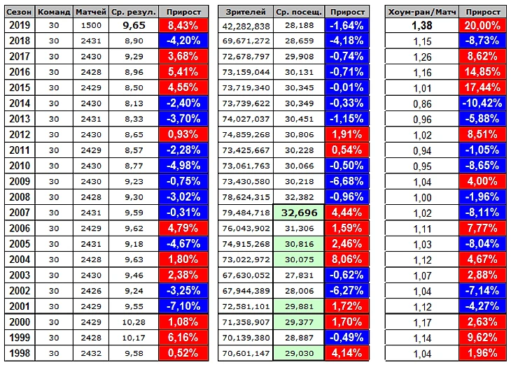 Главное, что при желании сторонники «теории заговора» могут вооружиться не одним вызывающим подозрение фактором и фактом. Если рассмотреть развитие ключевых показателей MLB, результативности и посещаемости, с момента окончательного оформления текущего пула из 30-ти франшиз в 1998 году и вплоть до нынешнего неоднозначного сезона, то обращают на себя внимание определенные тенденции.