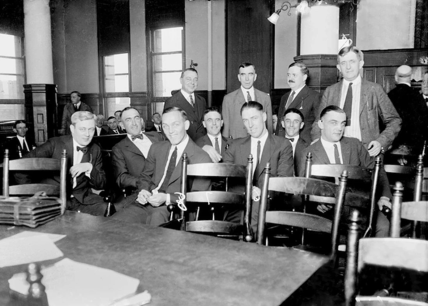 "7 октября 1920 года. Запомните эти лица, это те самые игроки "Уайт Сокс", которые пошли на мерзкое и наглое преступление, продав за деньги весь бейсбольный мир. Отныне их имена войдут в историю разве что из-за глубин их нравственного падения".